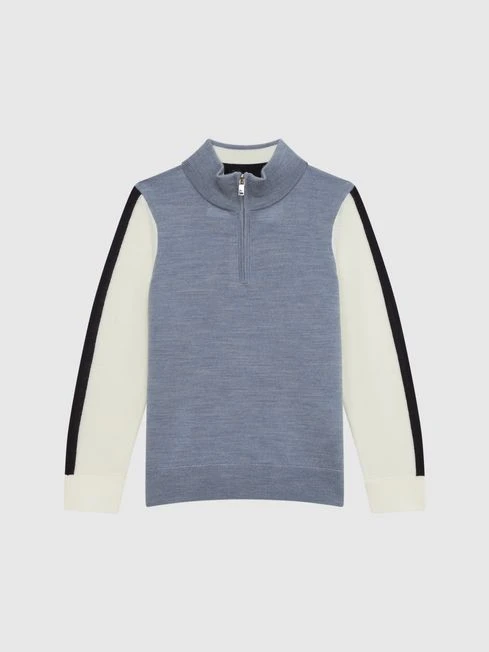Reiss Airforce Blue Melange Leo Senior Wool Colourblock Zip Neck Polo