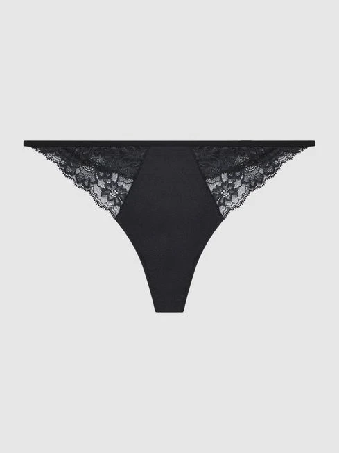 This black thong lends a seductive mood to your everyday, thanks to its intricate, scalloped lace detailing and satin front. Its thin, elasticated waistband sits midrise on the frame for a sleek feel and appearance beneath clothes.