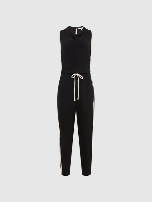 Taking inspiration from the popular athleisure trend, the Tyla jumpsuit presents a smart look with casual notes. The sleeveless, cowl-neck design is elegantly feminine, and the drawstring waistband offers an adjustable fit. Complete with a tapered-style trouser and side stripe design, this is the perfect ensemble for all manner of invites for this season and beyond. Customise your look with trainers, or choose heels to elevate the edit.