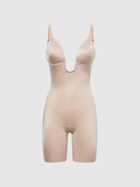 The Suit Your Fancy Plunge Low-Back Mid-Thigh Bodysuit is crafted from an ultra-thin, lightweight fabrication that shapes and smooths the frame. Its quick-dry composition makes it the perfect antidote to everyday chafing, and an Easy Access Gusset™ lends convenience. A plunge neckline and low-back design provide an invisible look under your edits. Adjustable, 5-way straps ensure versatility. Choose this bodysuit to build a flawless base beneath your edits.