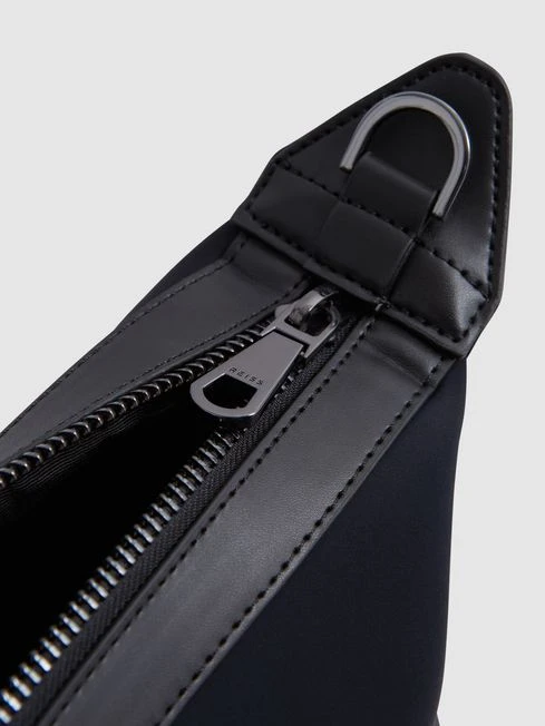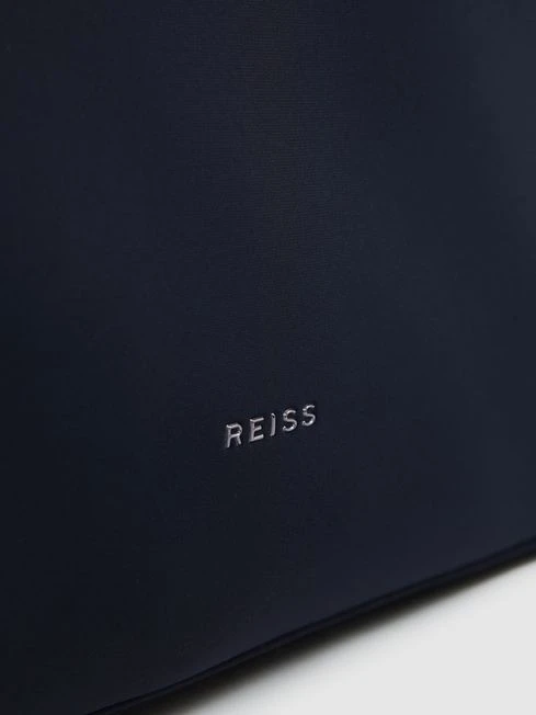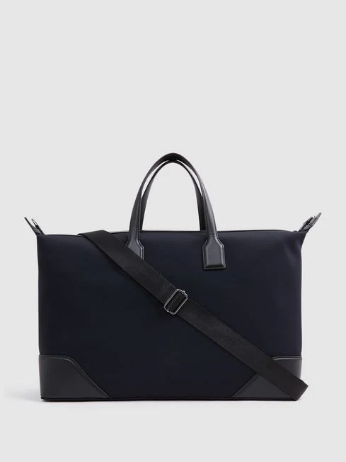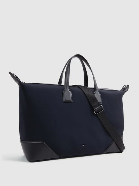 Travel in style with the Elliot holdall in dark navy, crafted from neoprene for a soft touch. It features grab handles and a removable, adjustable shoulder strap for versatility.