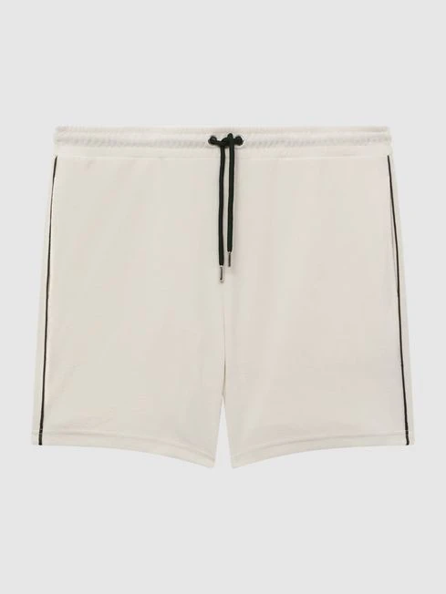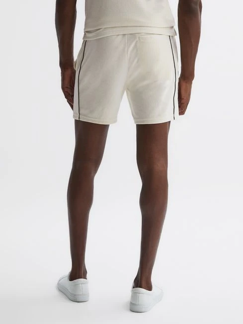 Choose the ecru Fredericks shorts for a modern take on textured styling. They’re crafted from a velour fabrication and designed with a black side stripe, for a sports-inspired look. A drawstring waist is added for a secure, comfortable fit. Pair with the coordinating shirt for a sleek daytime edit.