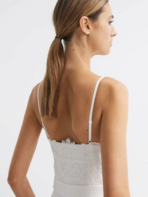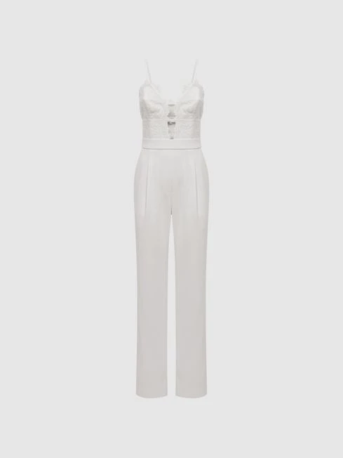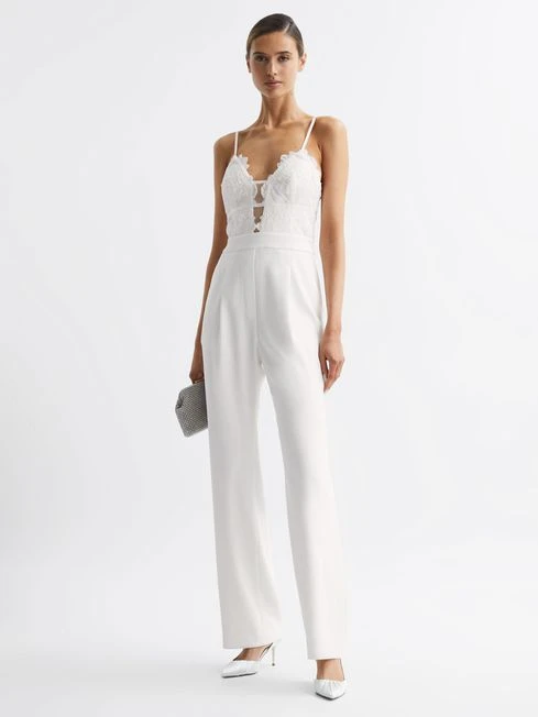 The ivory Cora jumpsuit is an elegant option for memorable occasions. It’s a fitted style, designed with a plunge neckline and embroidered lace detailing for feminine appeal. Side slip pockets and adjustable shoulder straps lend a functional note. Simply add heels to be instantly special-occasion ready.