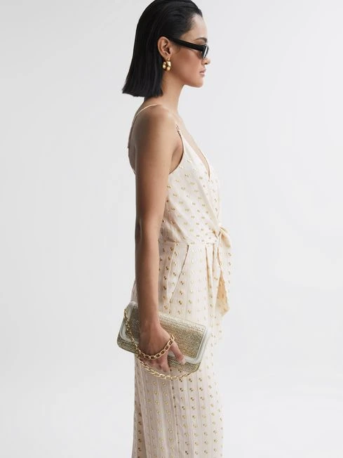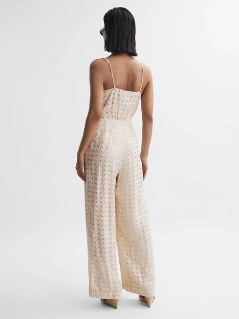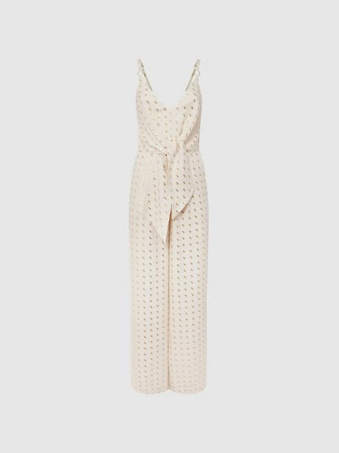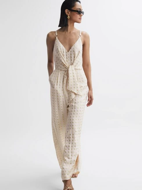 The Scarlet jumpsuit in ivory adds a decorative edge to a signature silhouette. It’s cut with a deep V-Neckline and fitted with adjustable shoulder straps. A tie element to the waist accentuates the frame and metallic detailing is featured throughout for a dazzling look. Get occasion-ready by adding wedge sandals and coordinating accessories.