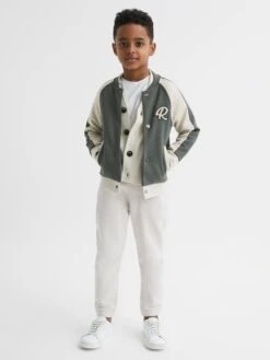 The Giles jacket is inspired by an on-trend varsity silhouette, fitted with raglan sleeves and a press-stud front closure. Its khaki/ecru colourblock design lends itself to a range of styling. Wear with cargo trousers or joggers for a modern edit.