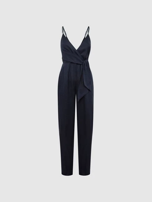 Opt for comfort and style with the navy Emilia jumpsuit. It’s crafted from 100% linen – ideal for warm climates – and lined with cotton for a lightweight, breathable edit. Chain detailing and a side-tie element are finishing touches to this piece. Complete the look with heels.