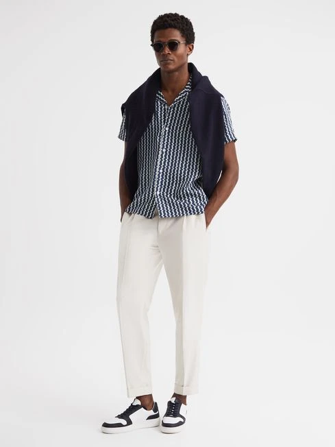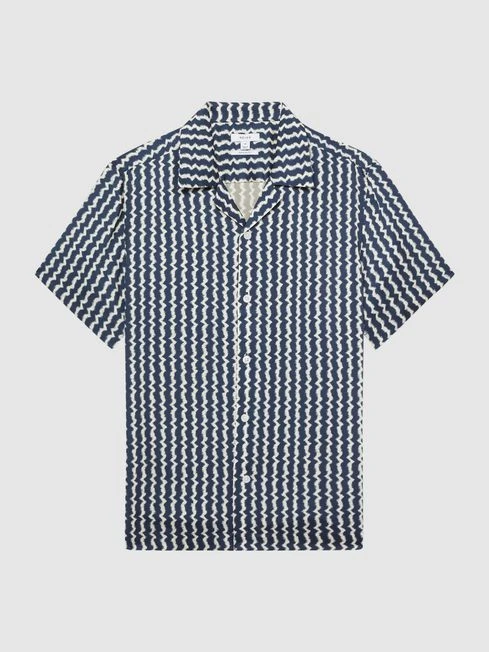 Inject enthusiasm into your new-season wardrobe with the slim fitting Mayday shirt in navy. It’s an abstract striped style, cut with a Cuban collar for a more formal feel. Wear unbuttoned over a T-shirt for a laidback look, or as a standalone piece as part of a sleek special occasion edit.