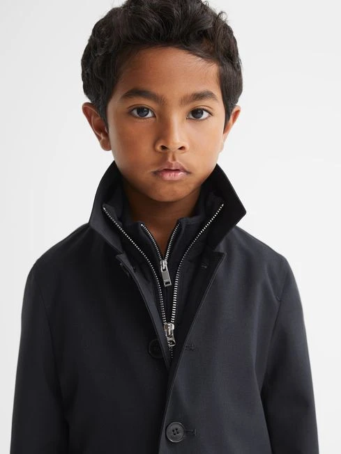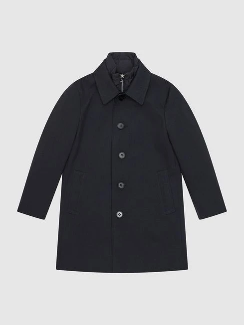 Stay dry in style courtesy of the Perrin mac in navy. It is designed with a quilted zip-through funnel neck insert, bringing warmth an unrivalled versatility to the outerwear collection. The longline silhouette ensures it works well with both smart and casual looks.