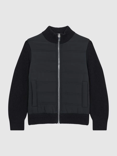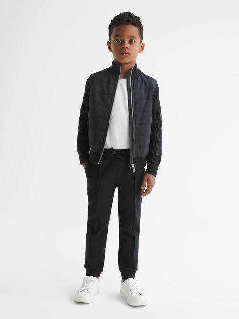The navy Trainer zip-though marries style with versatile appeal. It’s a hybrid design fitted with a knitted back panel, arms, and funnel neck whilst featuring a quilted shell front panel. The cotton-rich fabrication invites warmth and comfort, making this his go-to for any casual calling.