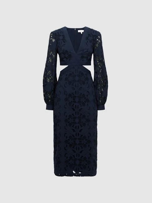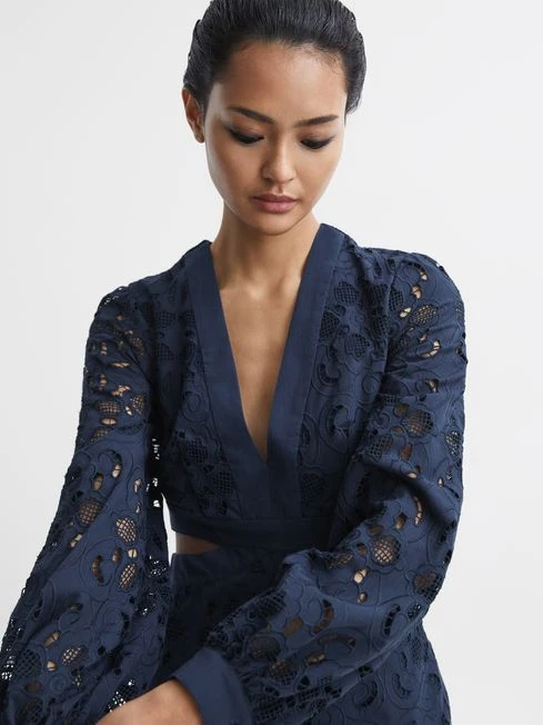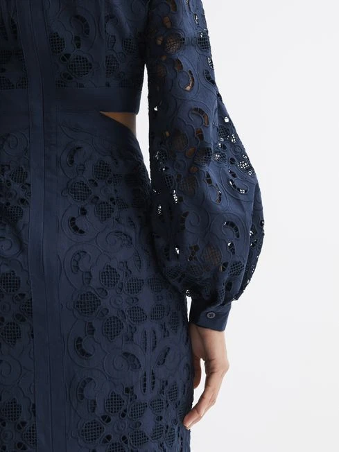 The navy Zena midi dress is the perfect addition to your occasionwear collection. It’s crafted from 100% cotton into a lace design and it’s fitted with balloon sleeves for a romantic feel. A plunge neckline and cut-out details add a sensual mood to this eveningwear centerpiece.