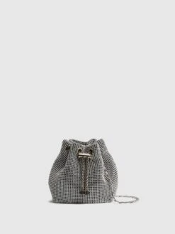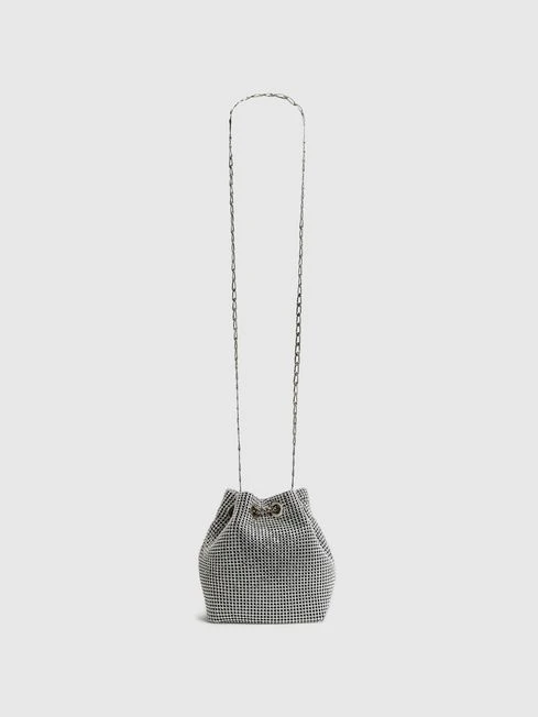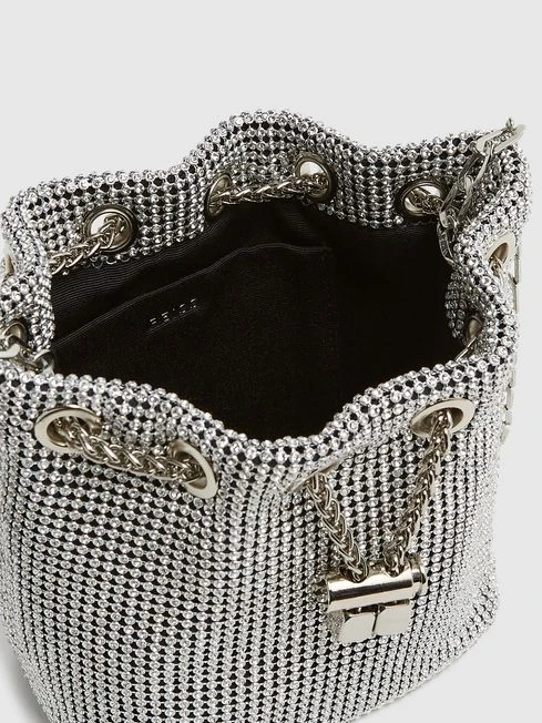 Transform your evening looks with the silver Demi bucket bag. This mini style is crafted from an embellished fabrication that catches the light for a dramatic mood. An adjustable chain shoulder strap allows for a customisable wear, suited to any occasionwear edit.