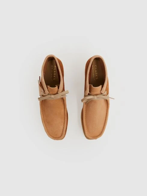 Clarks’ classic Wallabee boots return in a versatile tan colour block design, making them a favourable footwear option for now and years to come. Their supremely soft and lightweight suede upper contrasts against the pebbled crepe sole for added interest, remaining true to the brand s DNA. Tonal laces and branded fobs finish the look. Pair with jeans or chinos for effortless casual cool.