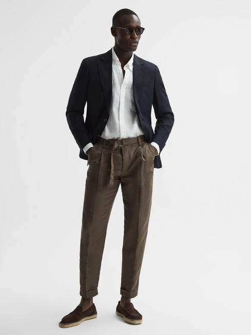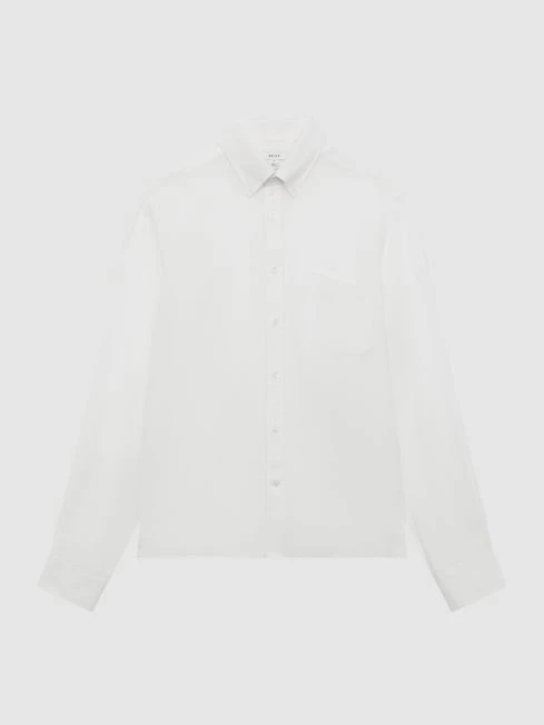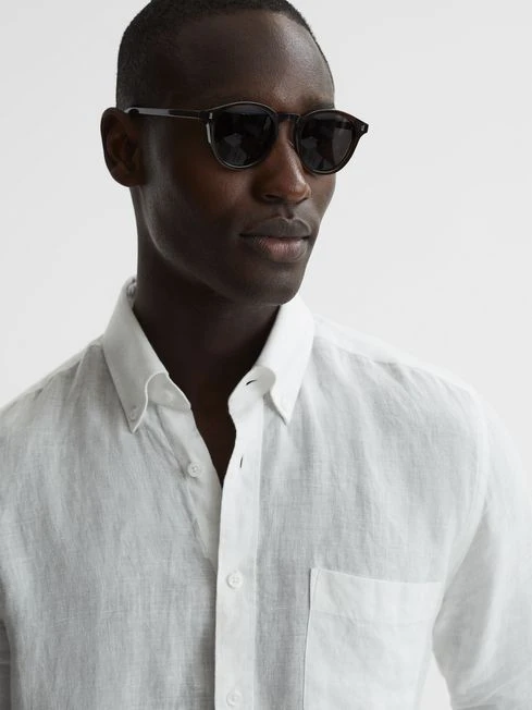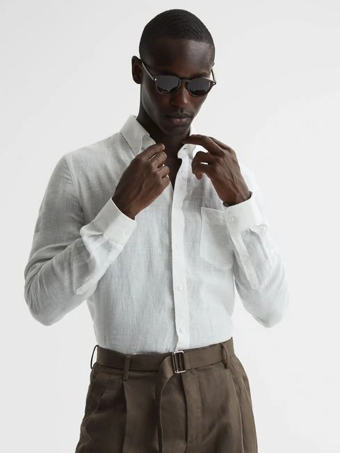The slim fit Queens shirt is fitted with a buttoned-down collar for refined dressing. This formal mood is offset by a linen fabrication, making it a lightweight and comfortable option for smart-casual days. Tuck into tailored trousers to build a structured look, or opt for jeans to suit your weekend plans.
